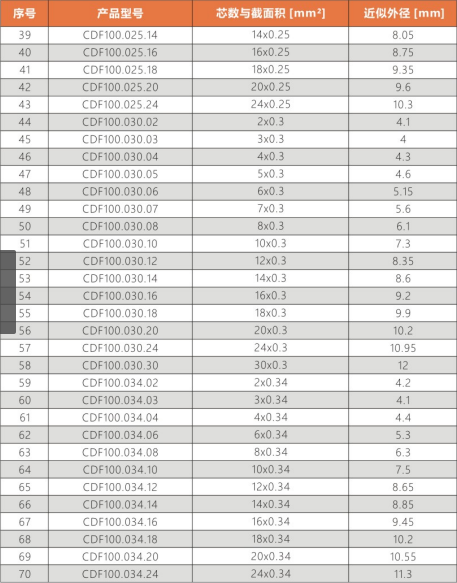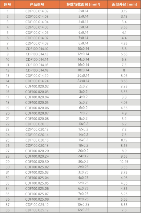 CDF100系列:適合于高速運動,標準彎曲半徑拖鏈中使用。耐磨/耐彎曲/阻燃/環保/抗撕裂等性能優異,耐油類附著。常用于:3C,醫療,新能源,航天,軍工裝備等行業拖鏈系統的信號傳輸。
